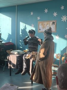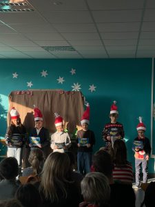 Potem sceną zawładnął teatr. W zabawnej opowieści K.I. Gałczyńskiego doskonale odnaleźli się uczniowie z klas młodszych. W osobnym repertuarze zaprezentowała się Ewa z klasy 6., kończąc swój wiersz o betlejemskiej gwieździe efektowną akrobacją.