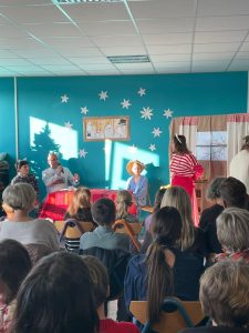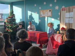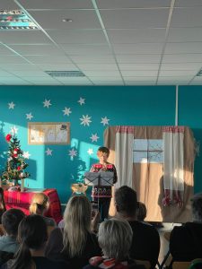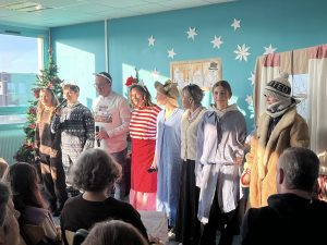 Tuż po Ewie na przepięknie udekorowanej przez panią Marię scenie pojawiły się Muminki! I to jakie! „Małe” – z klas 7, 8 i liceum oraz duże, czyli rodzice i przyjaciele szkoły: pan Wojtek Pajda, tata Dominika z kl.2, pani Adela Matuszak, mama Oli z kl.8 i pani Beata Woszczyńska, mama naszego absolwenta, Maksa, od lat wspierająca życie naszej społeczności. Co to jest Wigilia – próbowały odgadnąć Muminki, a cała publiczność dała się porwać ich przezabawnym poszukiwaniom.